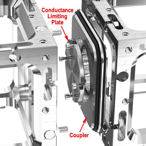 This is an   Vacuum Products IVP, 0.5 mm diameter orifice hole insert for the 6x6 Vacuum Cube. It mates between two IVP vacuum cube chambers and with a pin hole 0.5 mm orifice diameter becomes a conductance limiting coupler. A conductance limiting plate is needed to mate the insert, see middle graphic above. At low vacuum pressures, a conductance limiting orifice restricts the free molecular flow of gases and particles to only those mean free paths reflected through the orifice in a straight line. It may be used for dividing a given volume under vacuum into differing (upstream and downstream vacuum pressure) regions through which a particle or focused light beam must be passed. Our conductance limiting orifices may also be used for extra fine calibration of precision valves and flow meters, as well as fine control of gas flow in spectroscopy applications.