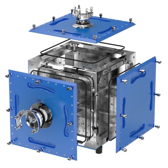 The Vacuum Cube can be configured with a wide variety of plates and windows with many options. A Vacuum Cube can be fitted feedthroughs for electrical power, thermocouple temperature measurements, optical lasers light or imaging detectors, gas supply, or fluid flow for heat/cooling recirculation lines. Compatible standard flange styles include KF-16, KF-25, KF-40, KF-50, ISO-63, along with conlfat CF 2.75, CF 3.375, and CF 4.5 inch flanged ports. Viewing windows are also available, and custom plates can be manufactured on request. An optional hinge kit can be ordered to convert any plate into an operable door.