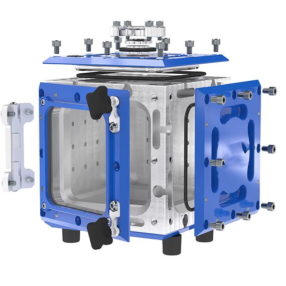 The large inner dimensions and open design of   Vacuum Cubes makes them perfect for many vacuum chamber applications and experiments. Vacuum Cubes are constructed of lightweight 6061-T6 aluminum alloy, allowing them to be easily transported around the lab and mounted on optical tables (unlike heavy stainless steel vacuum chambers). A patent-pending seal protective design, stainless steel thread inserts, and powder-coated outside plate finish help make the Vacuum Cube a durable tool for even the most demanding use.