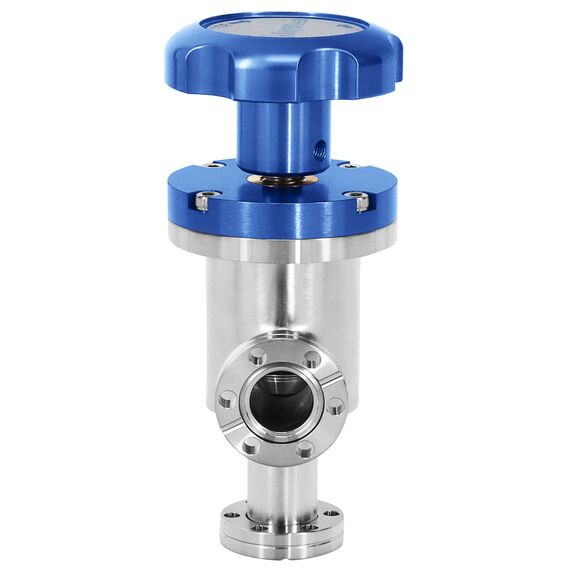 Vacuum Products Super-Seal High-Vacuum HV 90° Right Angle Manual Bellows Valve with Conflat CF 1.33 in. Through Hole Rotatable Flanges.