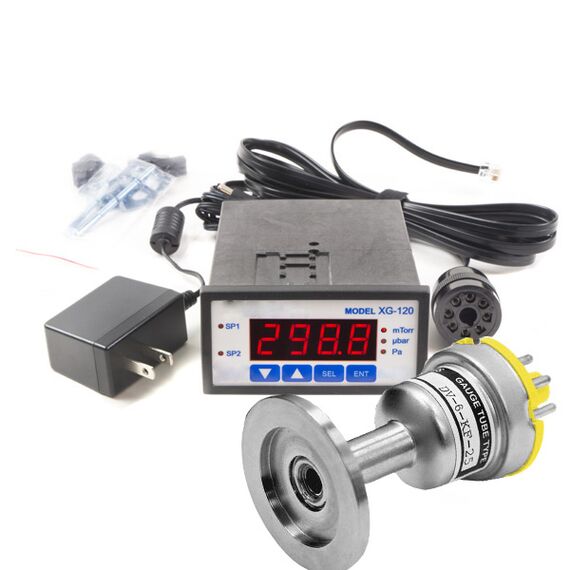 The XG-120 controller is available separately for use with your existing thermocouple gauge tubes and includes a power supply, a 10 ft. gauge tube sensor cable (RJ12 to female octal connector) and panel mounting hardware.