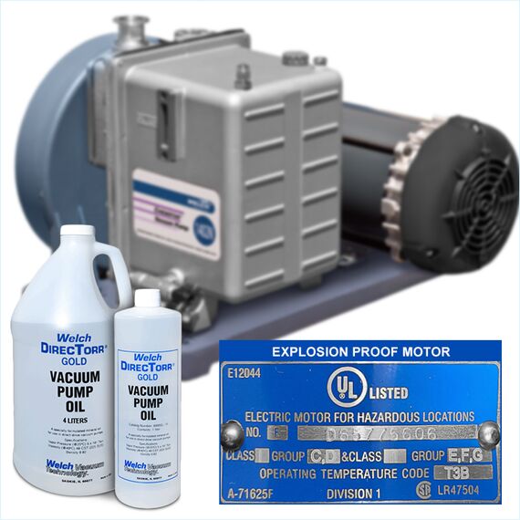 NOTE: Two-stage pumps should not be operated continuously at pressures above 10 Torr. Designed for environments where risk of building up concentrations of explosive/flammable vapors is high. Typically not required by EH&S for processing standard laboratory solvent vapors. XPRF Motors power cords do NOT have plugs on them, because to meet XPRF system requirements, all components must be XPRF, be sparkless, and power conduits must be wired to hermetically sealed electric junction boxes by a qualified electrician. If any component in the system, vacuum oven, freeze dryer, etc is NOT XPRF then you do not have an XPRF system. Many customers who order Welch Vacuum Pumps with XPRF motors appreciate being informed of the above information. From there they can consult with their EH&S department and decide if XPRF is indeed appropriate, or if choosing an alternative Welch-llmvac Vacuum Pump makes more sense for expense and/or delivery lead time reasons. Welch-llmvac cannot recommend for or against use of XPRF motored Vacuum Pumps. That decision must remain the responsibility of each customer.