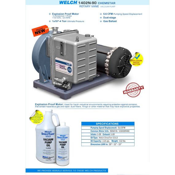 Welch 1402N ChemStar Explosion Proof Vacuum Pump, Chemical Resistant, Rotary Vane, New. PN: 1402N-90