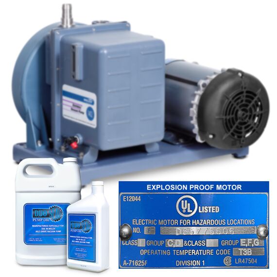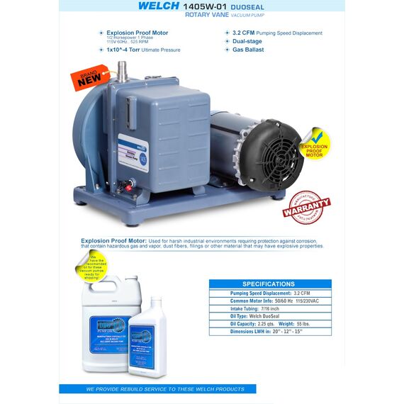 These Welch 1405 DuoSeal vacuum pumps are equipped with a 1-phase explosion proof motor which operates on 115V 60Hz. Each pumps come with a gas ballast; free air displacement of 3.2 CFM, ultimate pressure of 1x10^-4 Torr, oil capacity of 2.25 qts, requires intake tubing of 13/16 inch, and weights 55 lbs. Please refer to the recommendations made in the DuoSeal explosion proof owner's manual, which is available for download below. We recommend Welch DuoSeal oil for this pump. All accessories and oils for this pump can be found on this website.