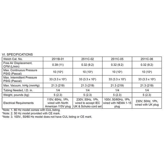 Applications Include: Filtration, Aspiration, Desiccation, Replace water aspirator and Vacuum Drying. The Welch 2511 WOB-L pressure and vacuum pump come with intake and discharge hose barbs which accept 1/4” ID rubber pressure and vacuum hose. Hose clamps should be used to hold the hose in place. For best results, we recommend the length of the tubing between the chamber and the pump be kept as small as possible. An Owners Manual in .PDF format is available for download to the side.